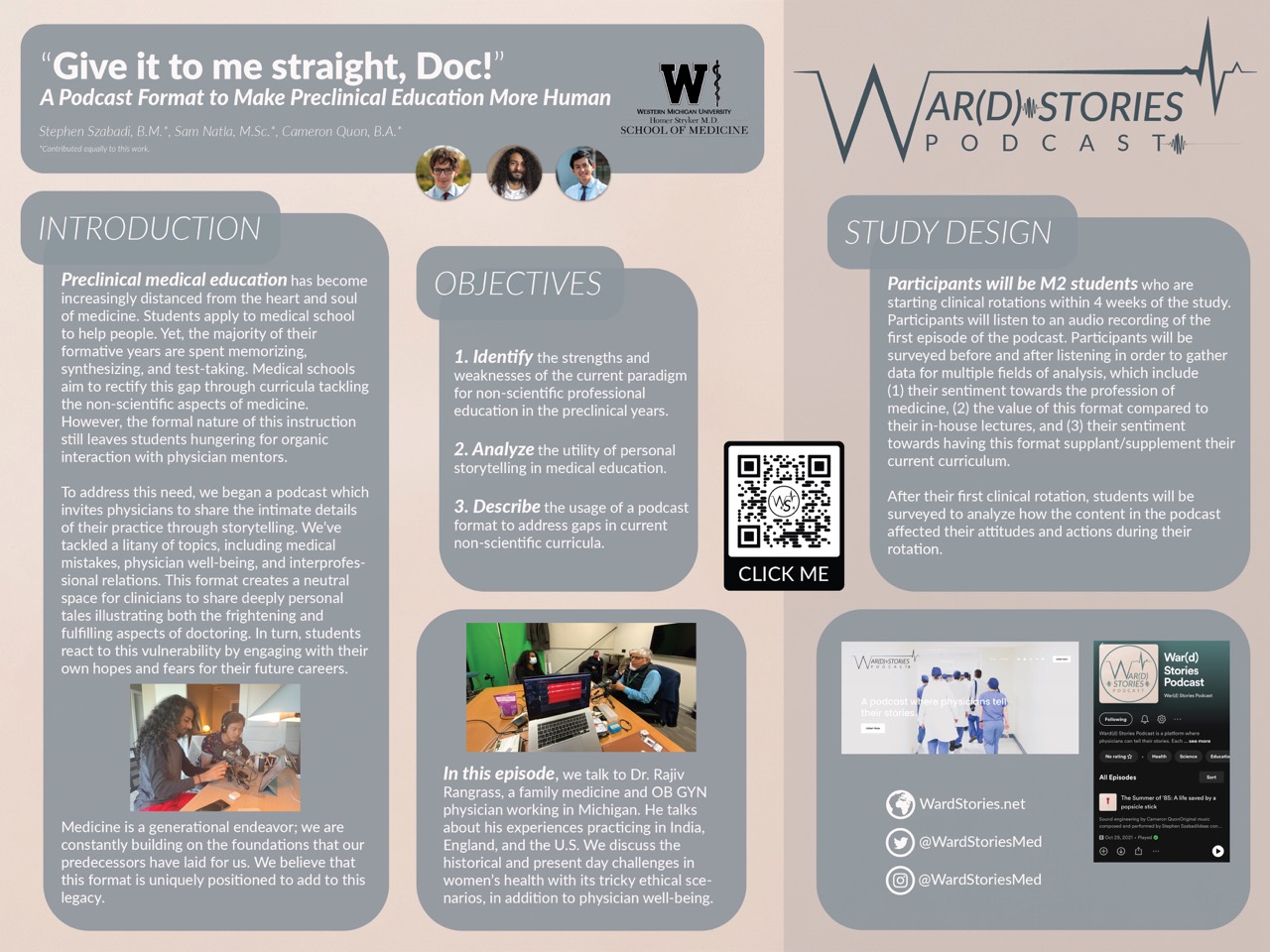 I created this poster with my colleagues on our project titled War(d) Stories, a podcast where we interview physicians on their clinical experiences geared towards an early medical student audience.