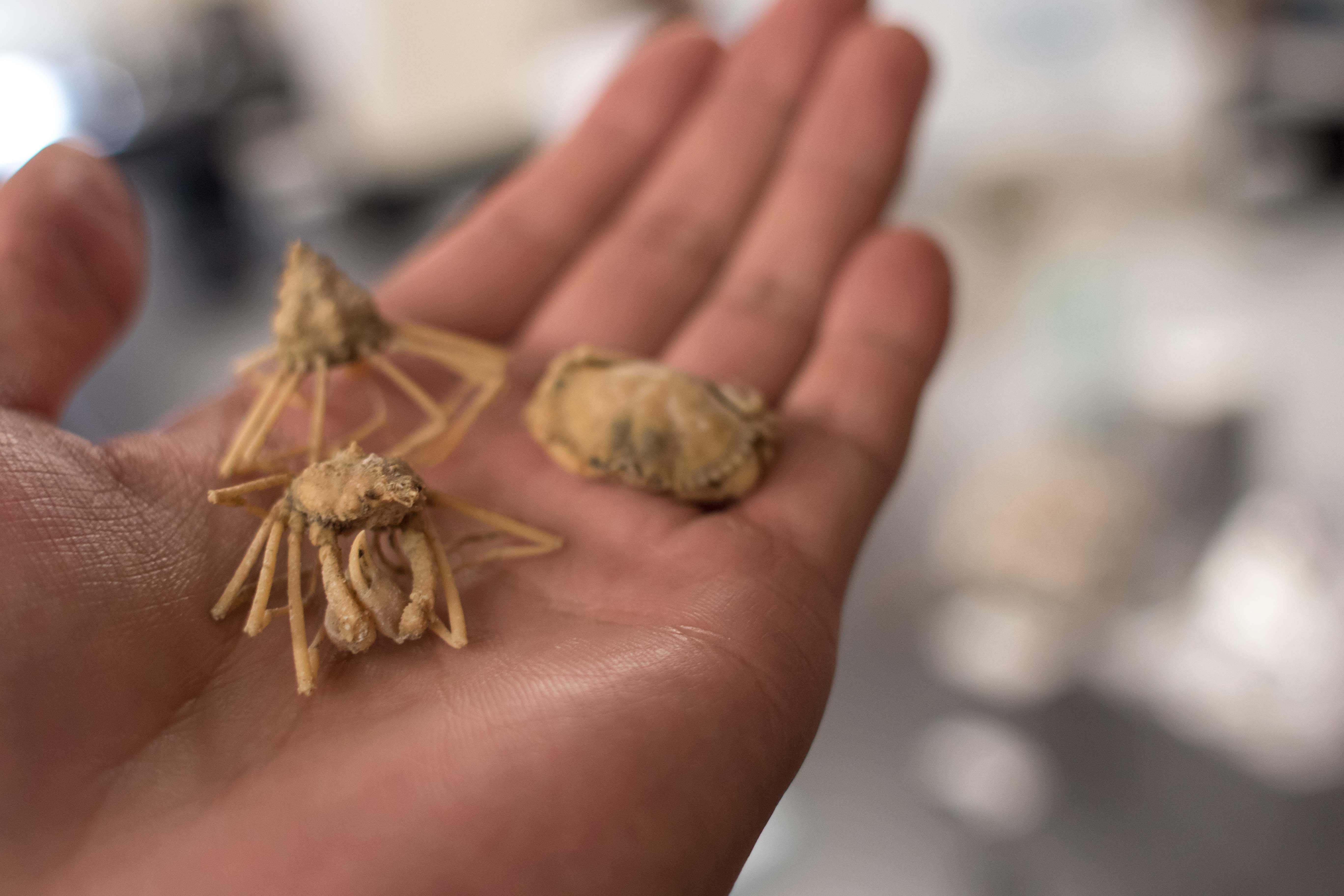 These are the spiders of the sea, known as crustaceans. They have exoskeletons, many appendages, and a segmented body.
