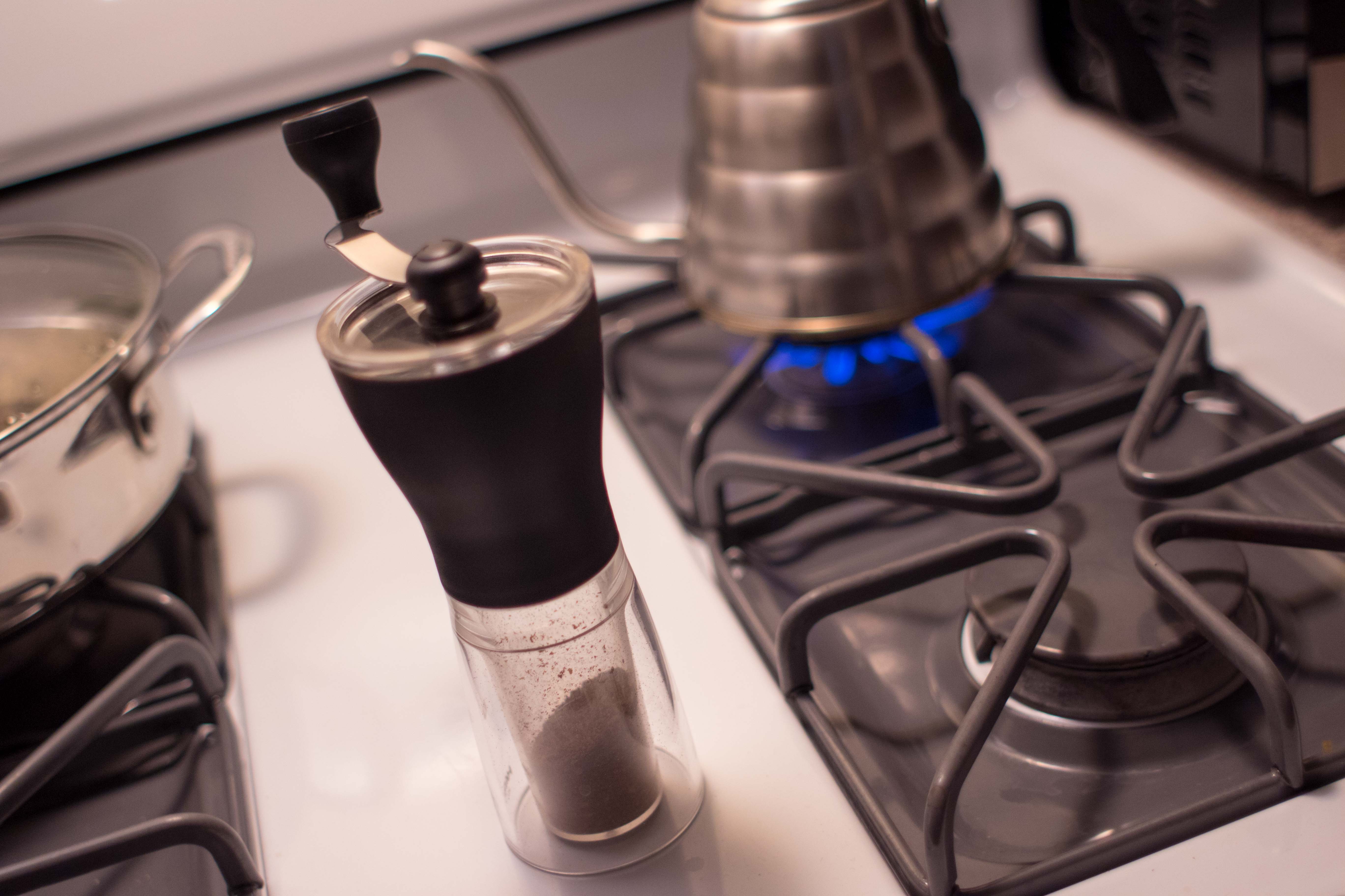 I hand-grind my beans while I wait for my water to boil in my gooseneck kettle.