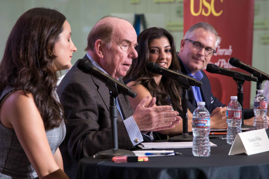 Before the debates began the event was opened with a panel. From left to right, the panelists included Christina Wilkes, a member of the USC College Republicans, Bob Shrum, a USC professor of the practice of practical politics, Tiffany Hoss, President of USC College Republicans and Matt Klink, partner of a public affairs firm.