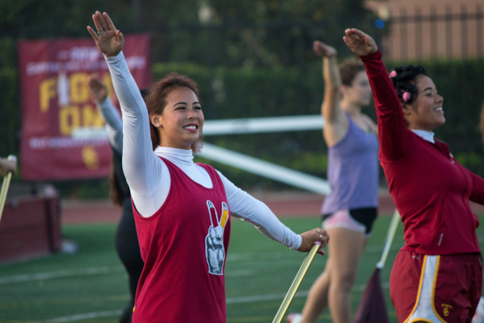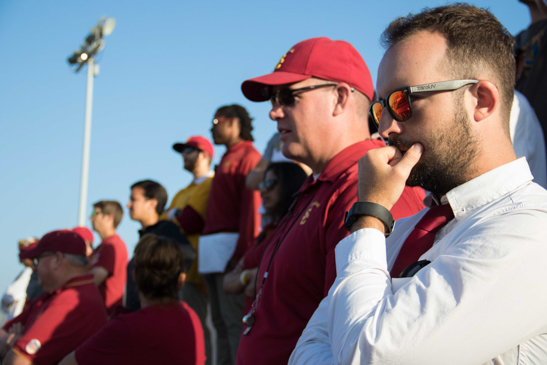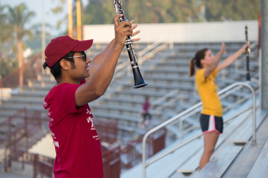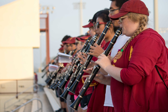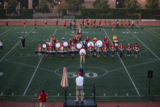 The marching band's directors watch on the very top of the stands, making final adjustments.