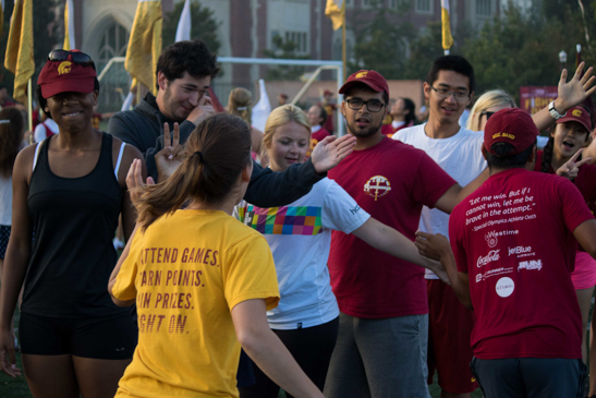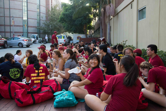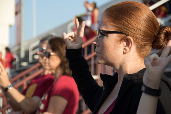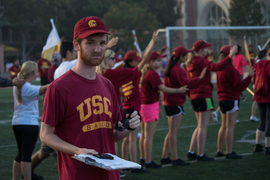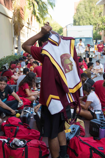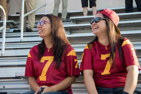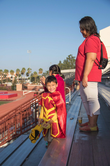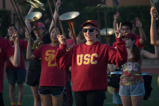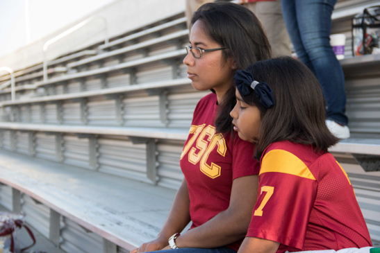 A boy has come to watch the band with his mom and sister. He is wrapped in a USC flag.