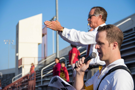 The official football anouncer has come to help with practice, so the band knows the routine.