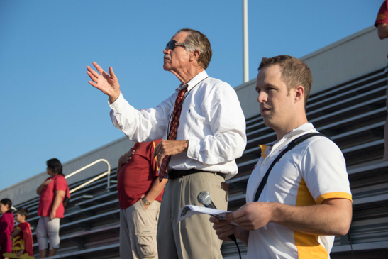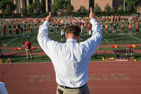 Dr. Bartner gives charge to the Trojan Marching Band.