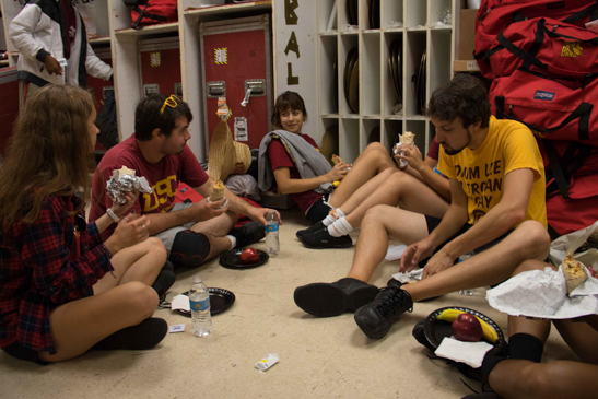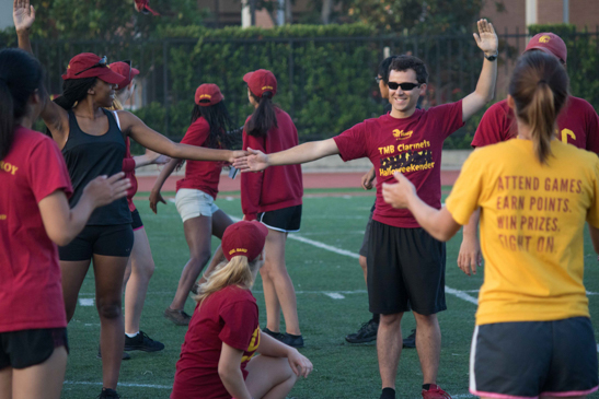 The clarinet section practices their tradition of kicking a shoe through a makeshift goal post.