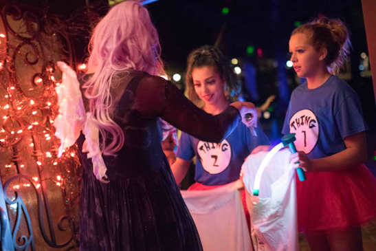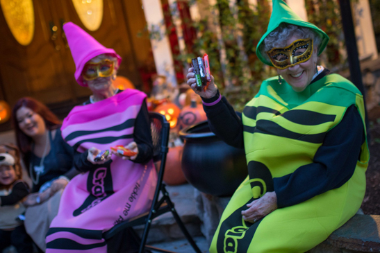 People of all ages pass out candy such as these older women dressed up as crayons.
