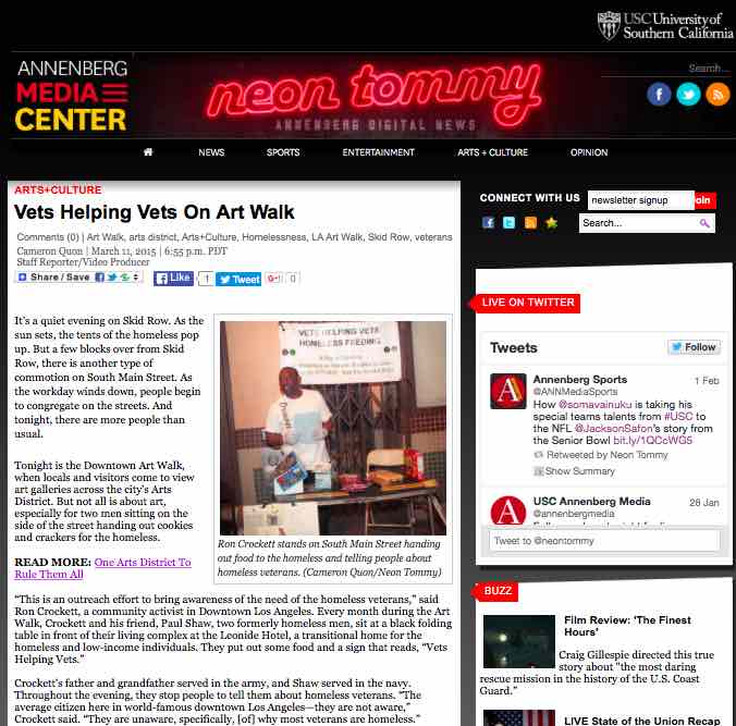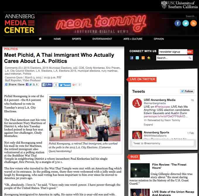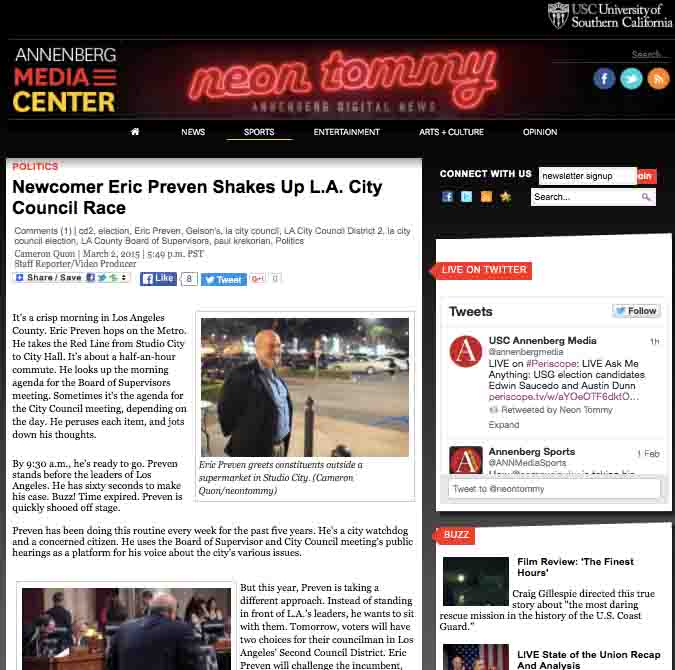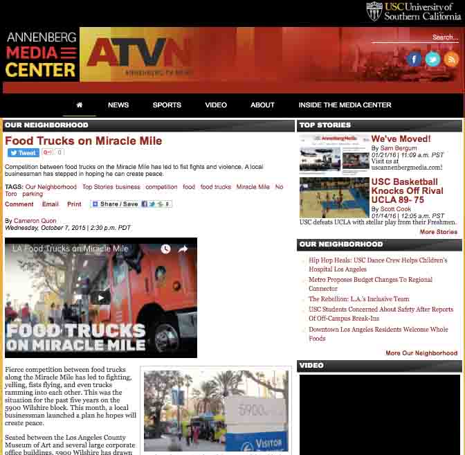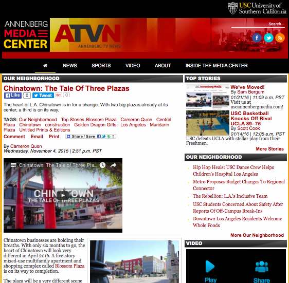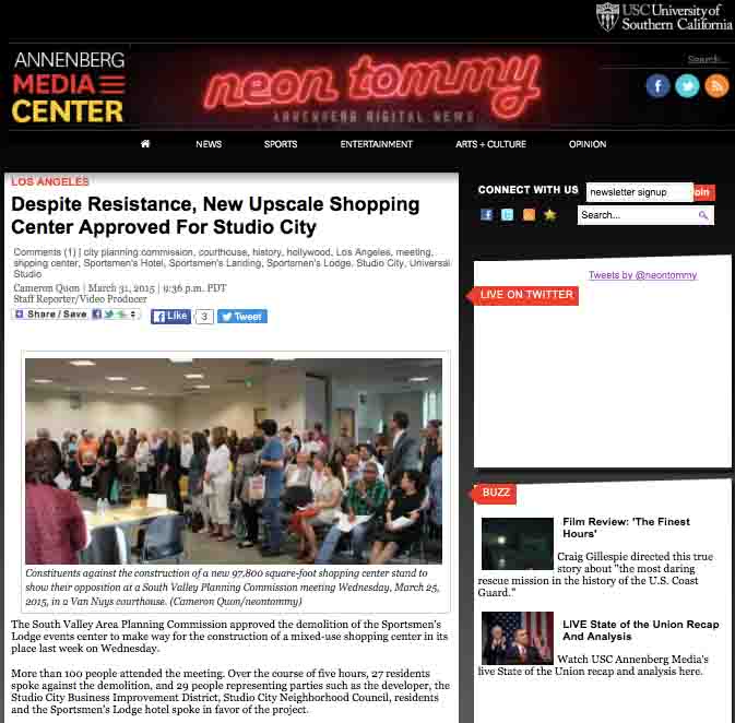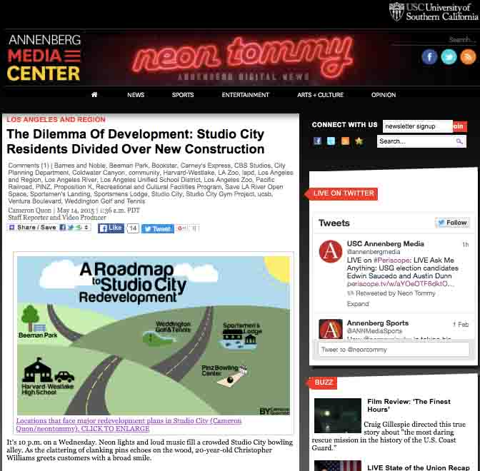 Jan 14, 2016 L.A. Dance Crew Brings Hip-Hop And Smiles To Kids In Hospital Dec 27, 2015 NaNoWriMo: The 30-Day Race To 50,000 Words Dec 11, 2015 The Los Angeles Public Library and the Quest for Community Nov 4, 2015 Chinatown: The Tale Of Three Plazas Oct 15, 2015 SPiN: The Table Tennis Club That's a Hot Spot for a Melting Pot Oct 7, 2015 Food Trucks on Miracle Mile May 14, 2015 The Dilemma Of Development: Studio City Residents Divided Over New Construction March 31, 2015 Despite Resistance, New Upscale Shopping Center Approved For Studio City March 11, 2015 Vets Helping Vets On Art Walk Mar 3, 2015 Meet Pichid, A Thai Immigrant Who Actually Cares About L.A. Politics March 2, 2015 Newcomer Eric Preven Shakes Up L.A. City Council Race Oct 20, 2014 Chinatown Reboot Dec 16, 2014 It May Be Raining, but the Drought's Not Over Dec 6, 2014 Recipe: A Caffeine-Filled Milkshake Perfect For Finals Week Oct 31, 2014 MIDTERM WATCH: Challenges Facing Farmers in California's 36th District